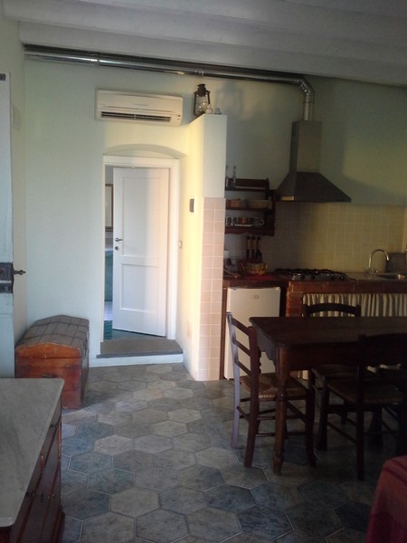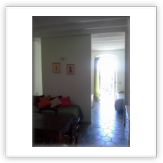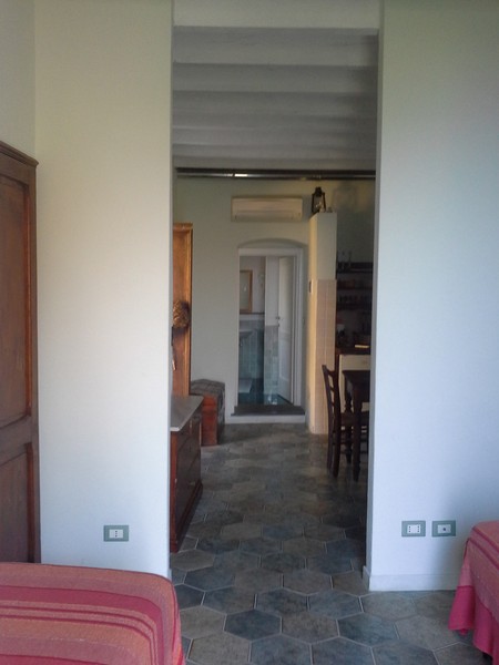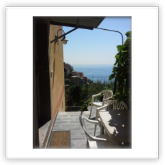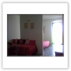 Appartamento Mare1° piano: ampio monolocale con parete divisoria con letto matrimoniale e due letti singoli; bagno e antibagno; balcone con vista mare e piccola corte esterna attrezzata con tavolino e sedie.